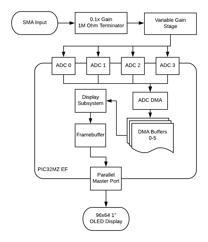Several ADCs are used in parallel to sample at the same time, resulting in the interleaving improving the sample rate. Since there are 120 Megabits per second of data coming from the ADC module, the Direct Memory Access (DMA) peripheral on the PIC32MZ allows for the writing of the data directly onto the memory of the microcontroller without involving the processor.