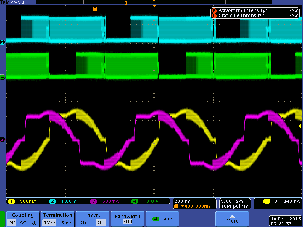 The yellow and pink traces are the current for each phase of the motor. The blue and green traces are the voltages on each terminal of the phase with the yellow current. [via Schrodinger Z]