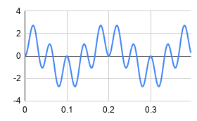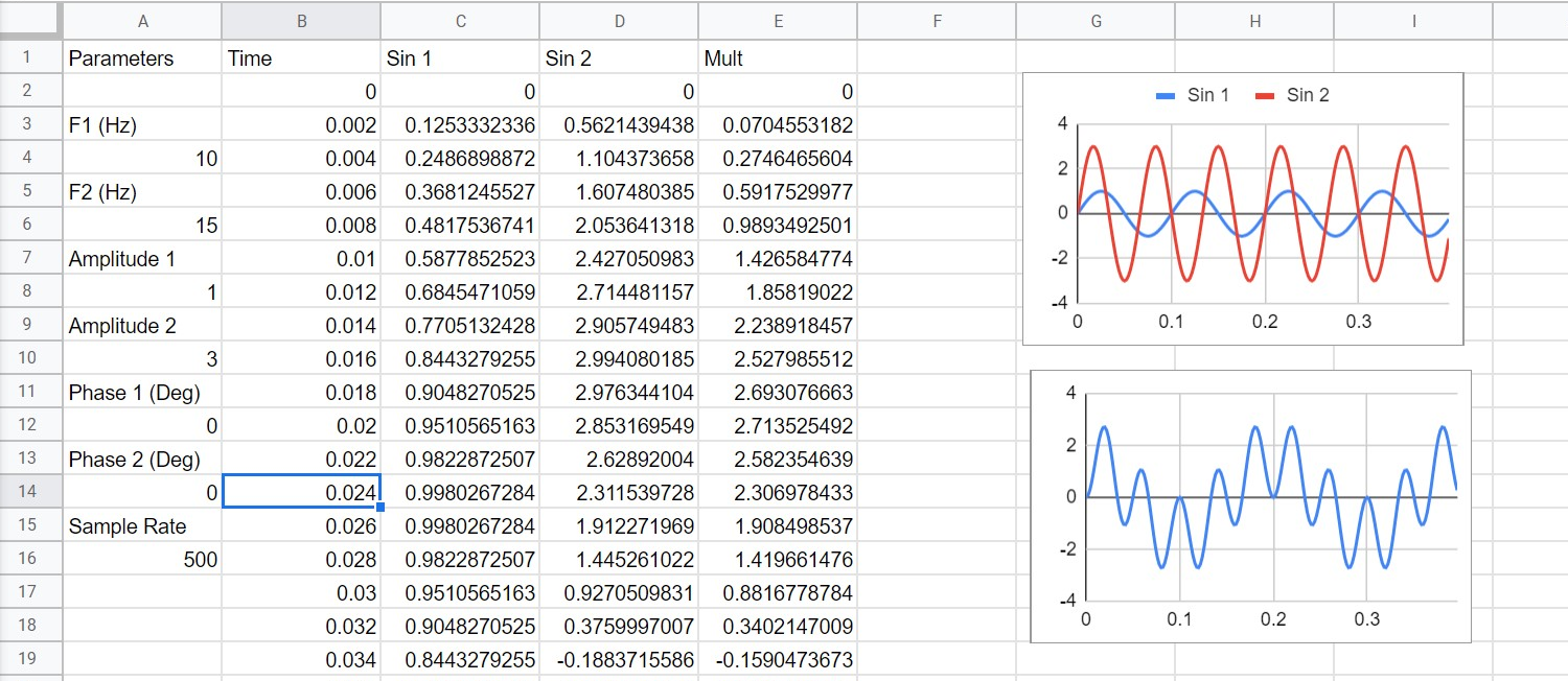 This is what the final spreadsheet looks like. There are two sine waves and we mix them together to get a sine wave that would decompose into the sum and their difference of the inputs. These are all real numbers — we’ll get to complex numbers in a later part of the series.