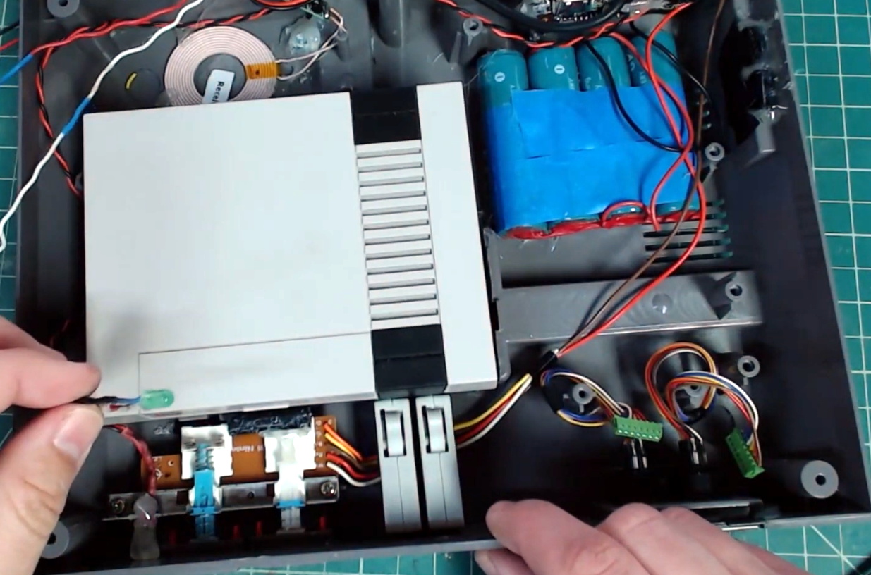 Frankly, that alone would have made this project worthwhile in our book, but [Geeksmithing] didn’t stop there. He also added in a pico projector that’s normally covered up by the black facia on the rear of the console, complete with a “kickstand” to tip the system up to the appropriate angle. Continuing with the theme of enabling ad-hoc NES play sessions, he also packed in enough batteries to keep the system running for a respectable amount of time. There’s even put an inductive charging coil in the bottom of the system so he can top off the batteries just by dropping the system on a modified SNES mousepad.