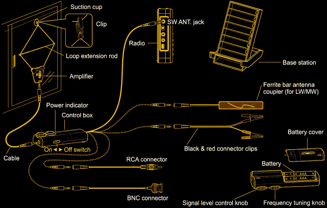 The antenna is not terribly cheap at about $50 or so, but there’s a lot in the box. The business end looks like something you’d wear around your neck. A small box has a switch for three bands — LW, AM, and SW. the two wires coming out of that box form a loop. You can stick the loop to something using a suction cup or a hook. There’s also a little bar that looks like a standard telescoping antenna but it has two plastic clips on the end. You use this to form the loop into a diamond shape with the telescoping rod about halfway.