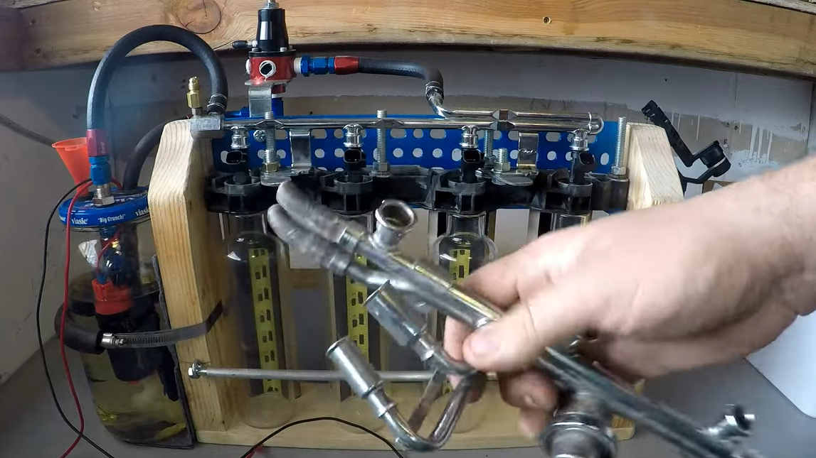 [Desert Rat Racer]’s test rig is designed to support four injectors at once and to test them under conditions as close as possible to what they’ll experience when installed. To that end, [Rat] mounted a junk intake manifold to a stand made from scrap wood and metal found by the side of the road. A pickle jar serves as a reservoir for the test fluid — he wisely used mineral spirits as a safer substitute for gasoline — and a scrap electric fuel pump pressurizes a junk fuel rail, which distributes fuel to the injectors under test.