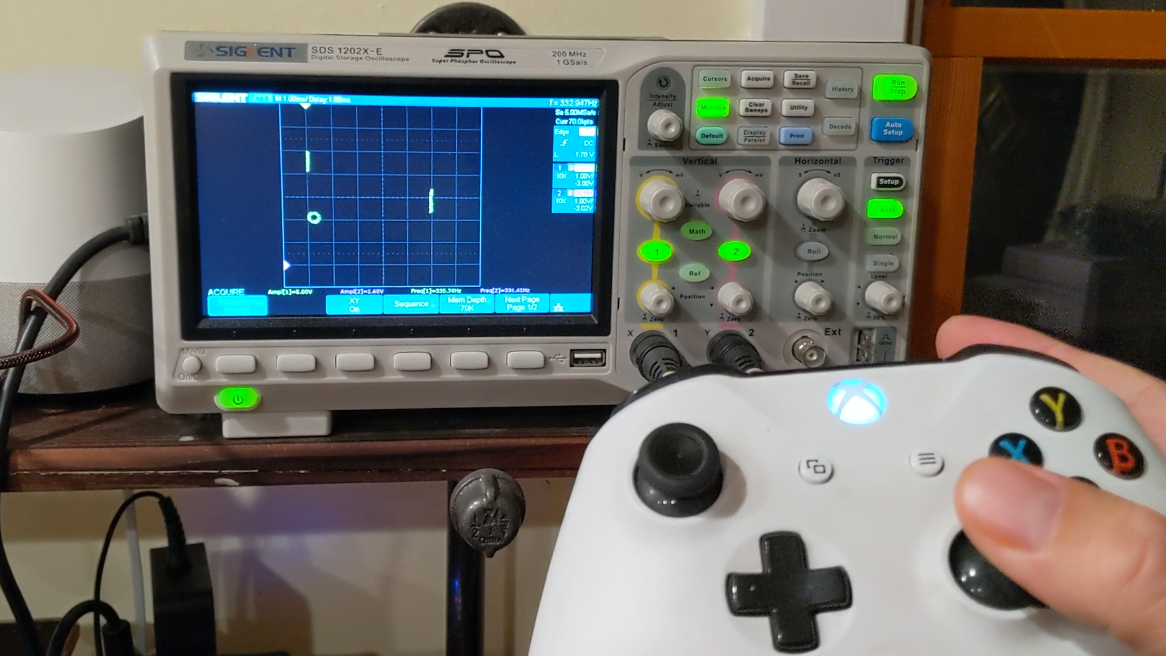 [Aaron Lager]’s Pi-O-Scope-Pong project takes a minimal approach to Pong by drawing on an oscilloscope to generate crisp paddles and ball. A Raspberry Pi takes care of the grunt work of signal generation, and even uses the two joysticks of an Xbox controller (connected to the Pi over Bluetooth) for inputs.