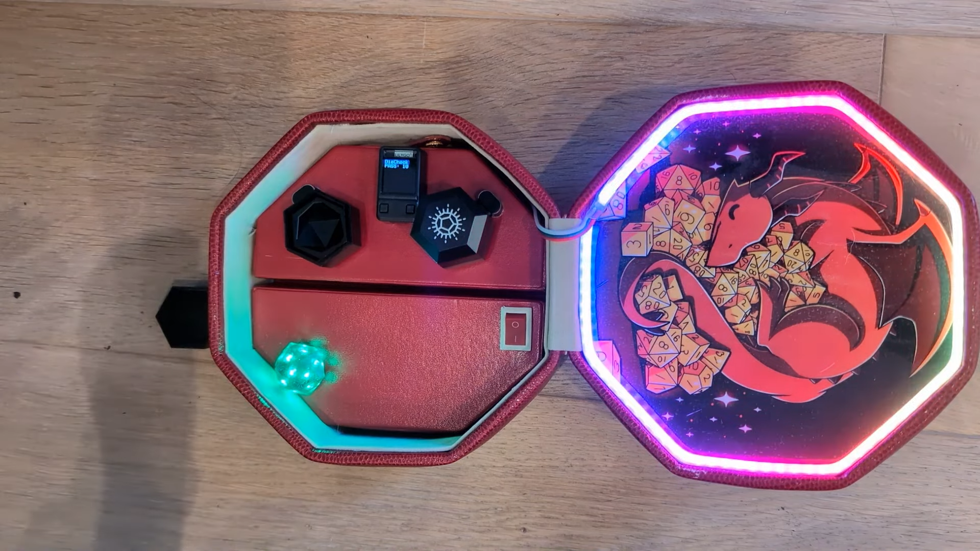 The project was built in a nice octagonal box [Jonathan] picked up from a thrift store. It was fitted with a hidden battery and ESP32 to communicate with the dice and run the show. The box also contains integrated wireless chargers to recharge the dice as needed, and a screen for displaying status information.