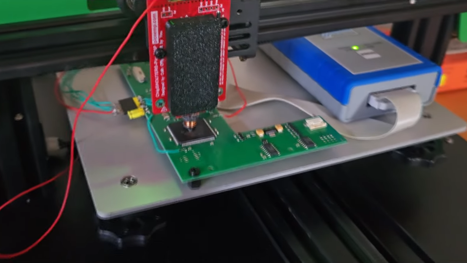 The trouble with the POC setup was that glitching the target chip, an LPC2388 microcontroller, involved manually scanning the business end of the PicoEMP over the package. That’s a tedious and error-prone process, which is perfect for automation. In the second video below, [Aaron] has affixed the PicoEMP to his 3D printer, giving him three-axis control of the tip position. That let him build up a heat map of potential spots to glitch, which eventually led to a successful fault injection attack and a clean firmware dump.