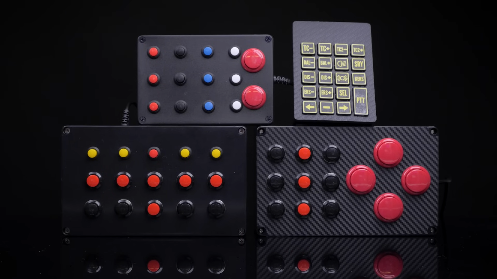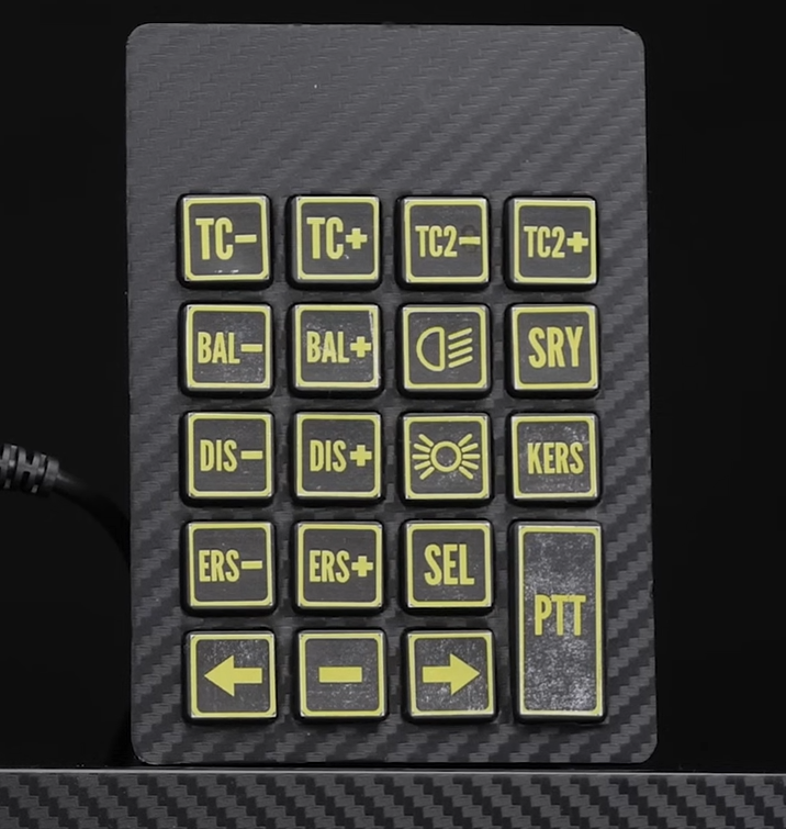 His final button pad looks straight out of a GT3 race car, but it’s the simplest of the bunch. It’s literally just a USB numpad with a carbon vinyl wrap applied and some home-printed labels. One suspects the feel isn’t particularly high-quality but the look is top tier. If you’re a streamer that wants to build a hardcore-looking setup, this is a great way to go.