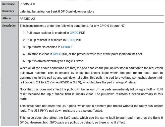 The newly released RP2350 microcontroller has a confirmed new bug in the current A2 stepping, affecting GPIO pull-down behavior. Listed in the Raspberry Pi RP2350 datasheet as errata RP2350-E9, it involves a situation where a GPIO pin is configured as a pull-down with input buffer enabled. After this pin is then driven to Vdd (e.g. 3.3V) and then disconnected, it will stay at around 2.1 – 2.2 V for a Vdd of 3.3V. This issue was discovered by [Ian Lesnet] of [Dangerous Prototypes] while working on an early hardware design using this MCU.