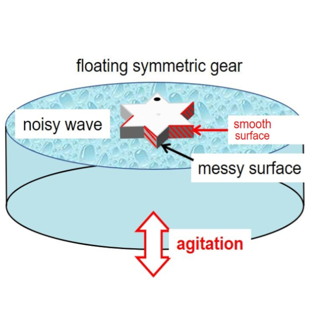This kind of mechanism is known as an active Brownian ratchet, but unlike other designs, this one doesn’t depend on the gear having asymmetrical geometry. Instead of an asymmetry in shape, there’s an asymmetry in the gear tooth surface treatments. You may be familiar with the terms hydrophobic and hydrophilic, which come down to a difference in surface wettability. The gear’s teeth having one side of each is what rectifies the chaotic agitation of the surrounding water into a one-way spin. Scaled down far enough, these could conceivably act as energy-harvesting micromotors.