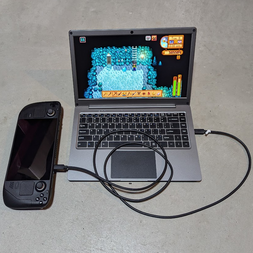 The USB-C port on the left is a 5 V output for exactly this purpose, but the one on the right side is a full-featured port that supports modes such as power delivery (PD) and DisplayPort video over USB-C. Devices that support video in this way include some mobile phones, and portable devices like Valve’s Steam Deck (shown here.)