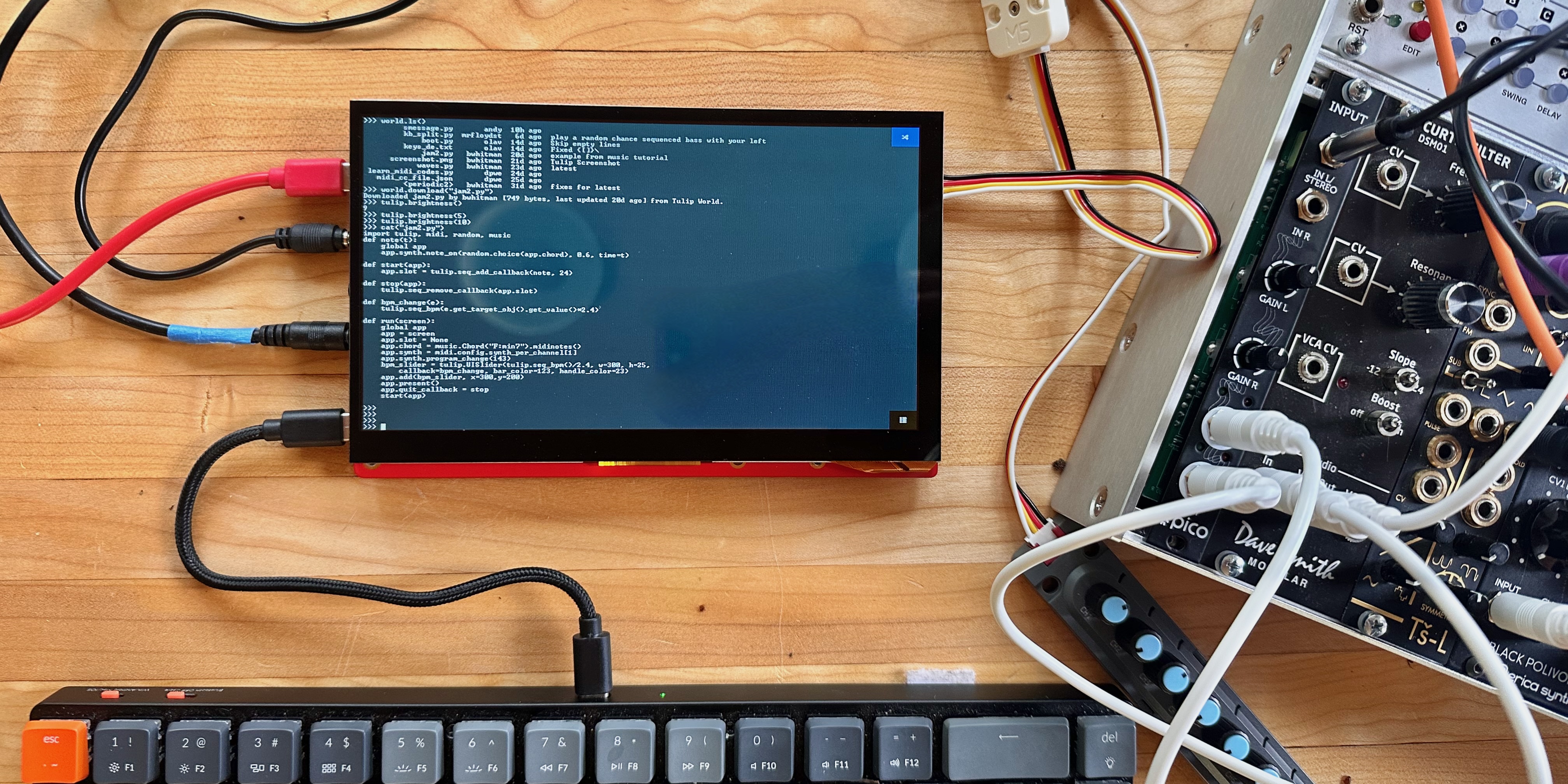 The most interesting part of Tulip for us, as programmer-musicians, is that it boots up into a Micrypython REPL. This is a synth workstation with a command-line prompt as its primary interface. It has an always-running main loop, and you make music by writing functions that register as callbacks with the main loop. If you were fast, you could probably live-code up something pretty interesting. Or maybe it wants to be extended into a physical musical instrument by taking in triggers from the ESP32’s GPIOs? Oh, and did we mention it sends MIDI out just as happily as it takes it in? What can’t Tulip do?