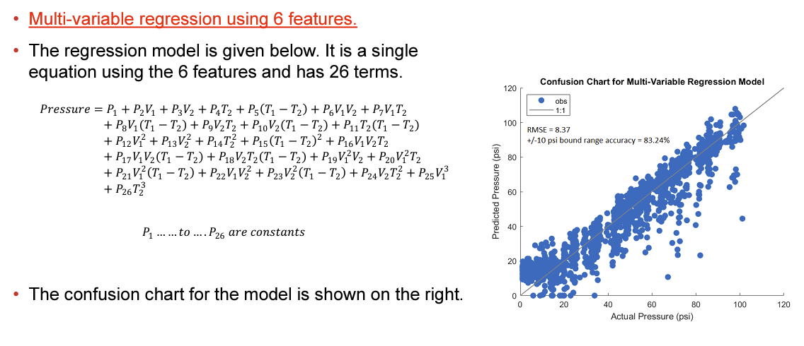 More work ensued, which tied pressure to multiple timing and voltage features on the curve. These were fed into a multi-variable regression that spat out a monstrous model that calculated pressure from six features and 26 terms. It was messy, but far more accurate, and it did the job.