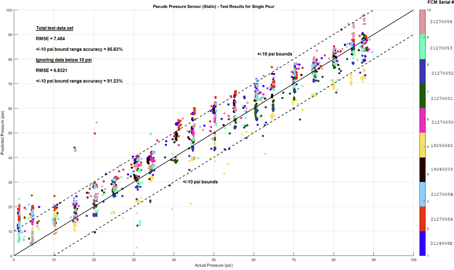 From there, it was a simple matter of deploying the model that measured FCM current and spat our pressure measurements. It was loaded on an ARM Cortex M microcontroller and put through 3,300 tests over 10 different FCMs and two different Freestyle controller boards. The model predicted the correct pressure within a bound of +/- 10 PSI a full 85% of the time.