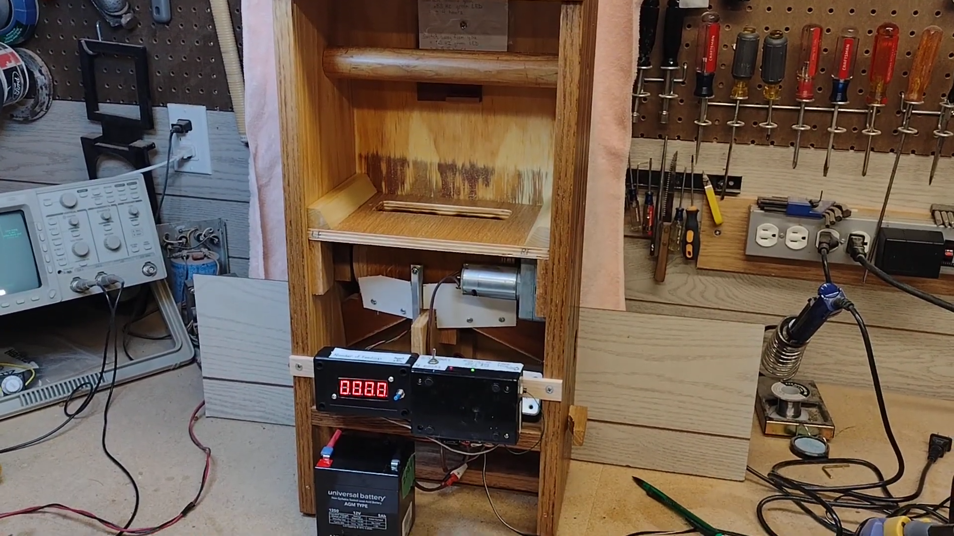 The feeder is built out of old plywood, and the whole thing runs off an old 12-volt DC wall wart and a lead-acid battery to keep it going in a power outage. The dry cat food is stored in hopper above a drum, with the drum rotated by a 12-volt DC gearmotor. The gearmotor is activated on a schedule—either every 4 hours, or every 5.5 hours, depending on setting. There’s then a four-digit 7-segment display for counting the total number of feedings.