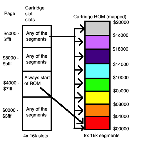 The MSX is based around the Z80, which has a 16-bit address bus, restricting it to 64K of ROM or RAM. The MSX has two cartridge slots, an ‘internal’ slot for the BIOS and RAM and a fourth for ‘misc’ use. Each of these is mapped internally into the physical address space. The cartridge slots have 64K of addressable space mapped into the Z80 physical space.