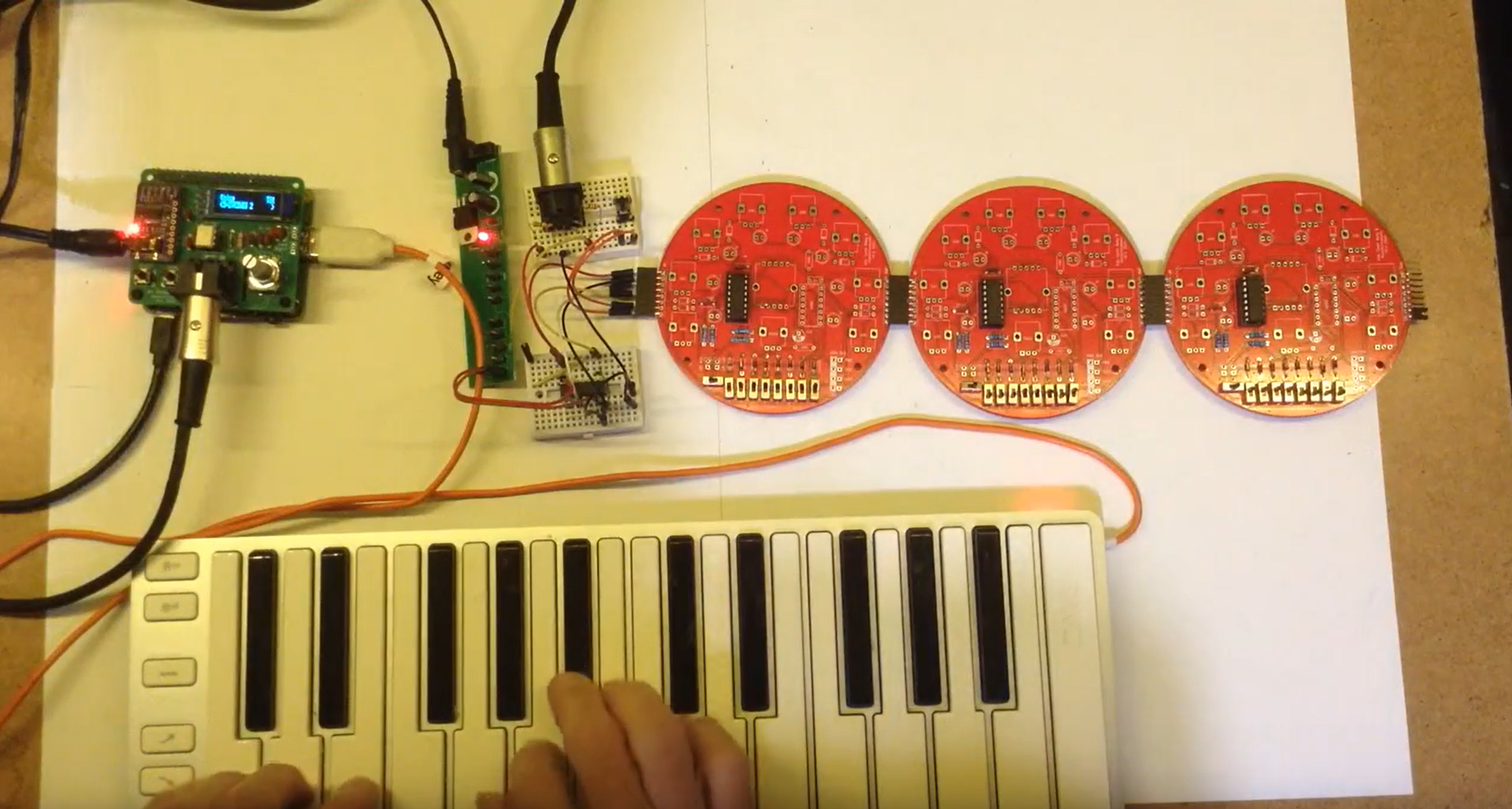 [Kevin] had previously built a control voltage step sequencer called the Baby8, which relied on 4017 counter ICs. He later realized he could repurpose three of his old Baby8 PCBs to create something that could generate MIDI using nothing more than discrete logic. The stack of three boards generate a simple MIDI message—in this case, a two-byte Program Change command. At 8 bits per byte, plus a start and stop bit, that comes out to 20 bits in total. The bits to be sent are configured via the switches on the PCBs, and clocked out through the counter ICs via a clock running at the MIDI baud rate of 31,250 Hz.