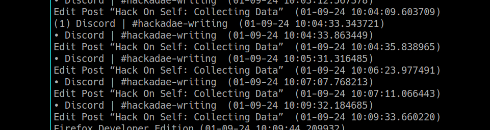 Thankfully, my laptop runs Linux, a hacker-friendly OS. I quickly wrote a Python script that polls the currently focused window, writing every change into a logfile, each day a new file. A fair bit of disk activity, but nothing that my SSDs can’t handle. Initially, I just let the script run 24/7, writing its silly little logs every time I Alt-Tabbed or opened a new window, checking them manually when I needed to give a client a retrospective estimate.
