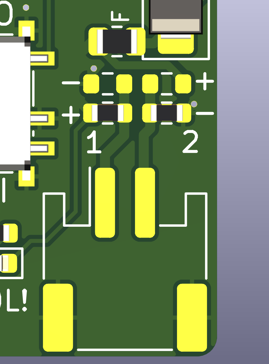 Back to cells with JST-PH connectors. Are you developing a project that will get into hackers’ hands, and you don’t want to have them rewire their entire LiIon cell arsenal just for your device? Thankfully, 0 R resistors save the day; it’s dead simple to add two pairs of 0603 0R’s next to a JST-PH 2-pin connector. Make one polarity the default, and leave the option of switching the polarity in there. Again, this goes before the fuse, and before the reverse polarity LED, too. Of course, your users will have to make sure the red wire goes to positive, but at least you’re helping them get there.