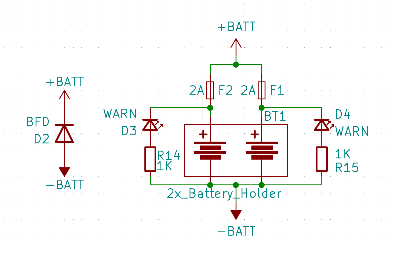 You might also want the user, whether you or someone else (especially someone else!) to quickly notice that the polarity is flipped. The solution is simple – add a LED and a resistor flipped in a way it lights up when the cell is reversed, before the fuse. Use a red or orange LED to make it crystal clear that something is wrong; don’t use green or blue, or any colours that often mean “the device is working normally”; add silkscreen markings to indicate that this is a “wrong polarity” LED.