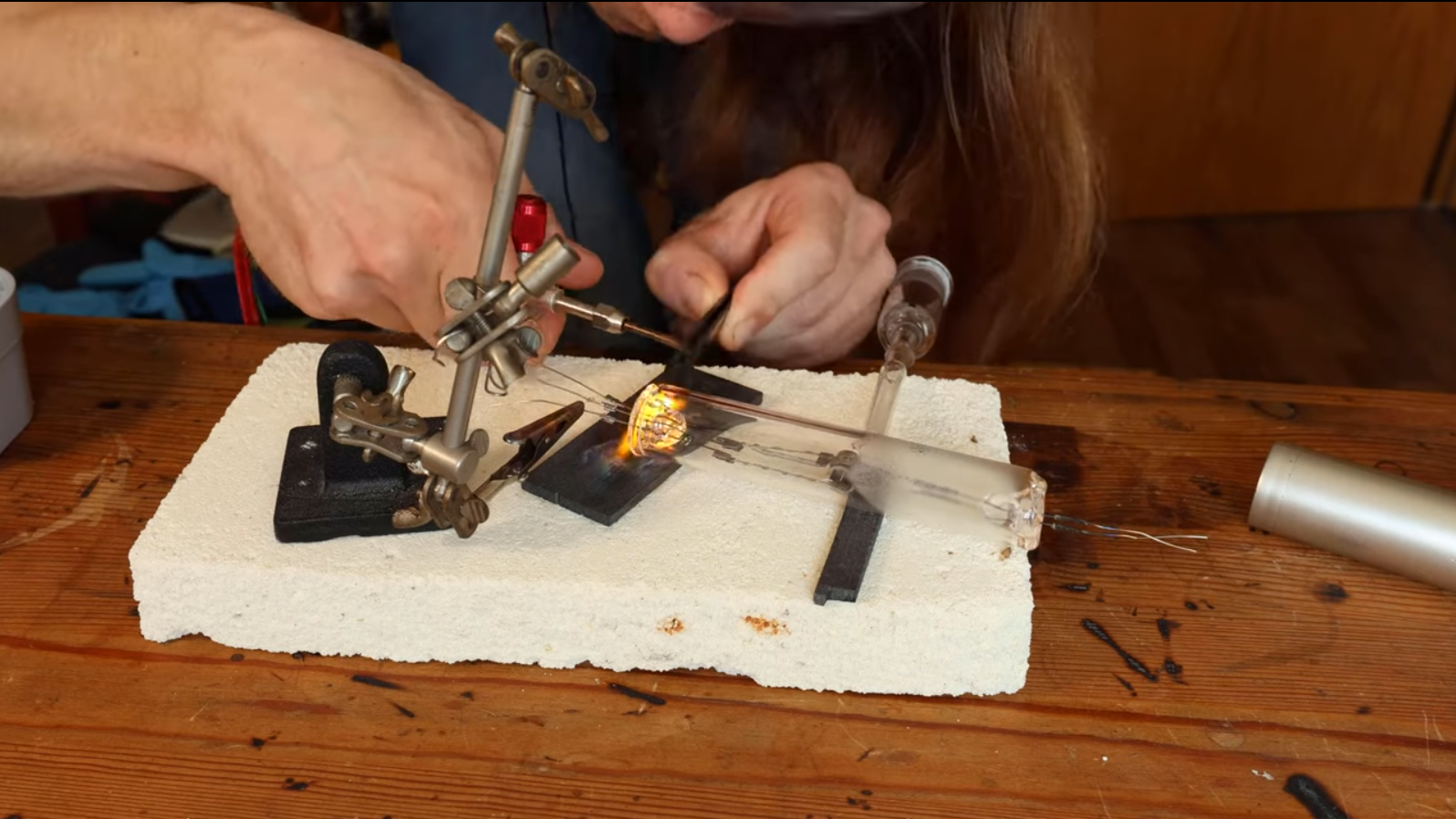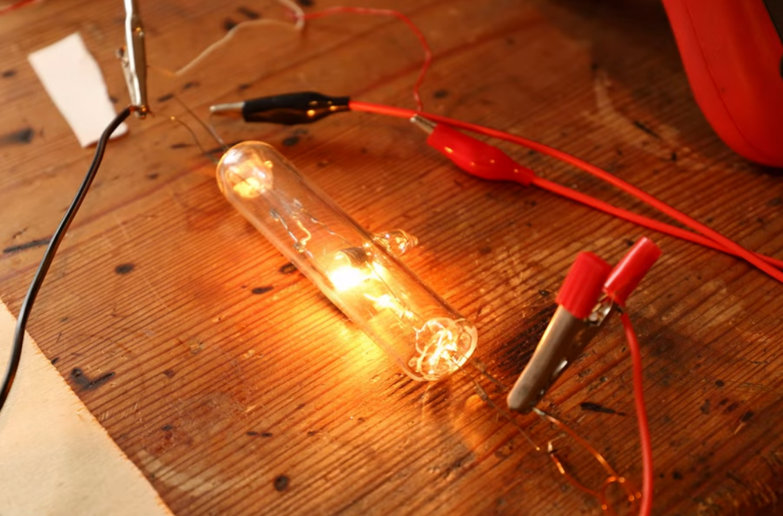 The construction starts with pre-made end seals with the tungsten wire electrode wire passing through. In the first video, they attempted to coat the cathode with barium nitrate, but this flaked off, ruining the tube. The second attempt replaces the coiled filament with a straight wire and uses a coating paste made from Barium Carbonate mixed with nitrocellulose in a bit of acetone. When heated, the nitrocellulose and the carbonate will decompose, hopefully leaving the barium coating intact. After inserting the electrode assembly into a section of a test tube and welding on the ends, the vacuum could be pulled and sealed off. After preheating the cathode, some gasses will be emitted into the vacuum, which is then adsorbed into a nearby titanium wire getter. At least, that’s the theory.