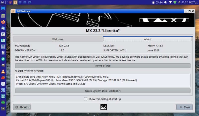 Upon booting, the CMOS battery was of course empty, but the system happily continued booting into MX Linux. The Debian update repositories were of course gone, but changing these to the archive version allowed for some (very old) updates. This raised the question of whether modern Linux would even run on this ancient Atom CPU, the answer of which turned out to be a resounding ‘yes’, as MX Linux still offers 32-bit builds of its most recent releases. A 15 minute upgrade process later, and a 2 minute boot later, the system was running a Linux 6.1 kernel with Xfce desktop.