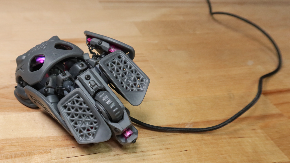 The design has a fixed central core, with each button (including the central scroller) separately adjustable. The side panel with a pair of thumb buttons is also moveable. Creating a model in Rhino 3D working with the grasshopper visual programming environment [Charlies] explored the surface constraints for the base, claw, finger and vertical grip styles common among mouse users. This model was then fed into Fusion 360 for the detailed design. After completing the design, it was passed back into Rhino 3D to add lattice effects to the panel. This helps reduce weight and lets the internal LEDs shine through. The design is intended for resin printing, so you could go wild with the visuals by missing custom resins if you were so inclined.