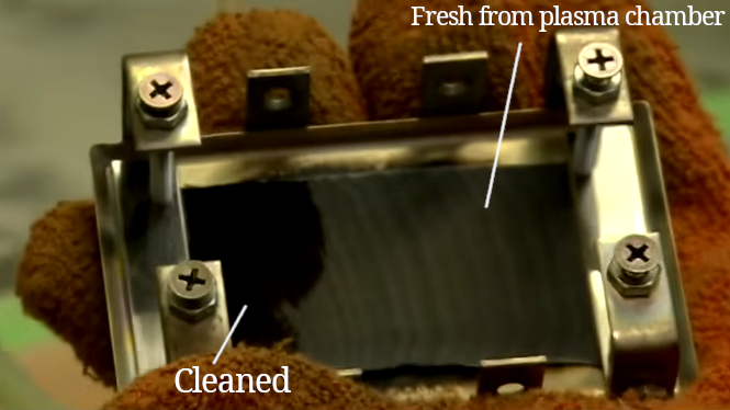 The discovery was partially accidental, as researchers happened upon it while looking at using high-energy plasma etching to machine the surface of wood in order to improve it’s water resistance. In the process of doing so, they discovered that with the right process applied to the right thickness and orientation of wood grain, the plasma treatment resulted in a surprisingly dark end result. Fresh from the plasma chamber, a wood sample has a thin coating of white powder that, once removed, reveals an ultra-black surface.