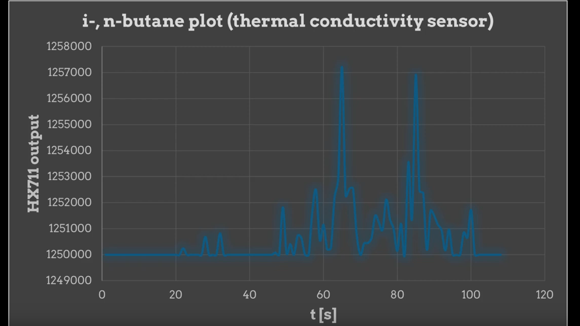 After purging the column and warming up the sensors, [Markus] injected a sample of lighter fuel and exported the data to Excel. The MQ-2 clearly shows two fractions coming off the column, which makes sense for the mix of propane and butane in the lighter fuel. You can also see two peaks in the thermal conductivity data from a different fuel containing only butane, corresponding to the two different isomers of the four-carbon alkane.