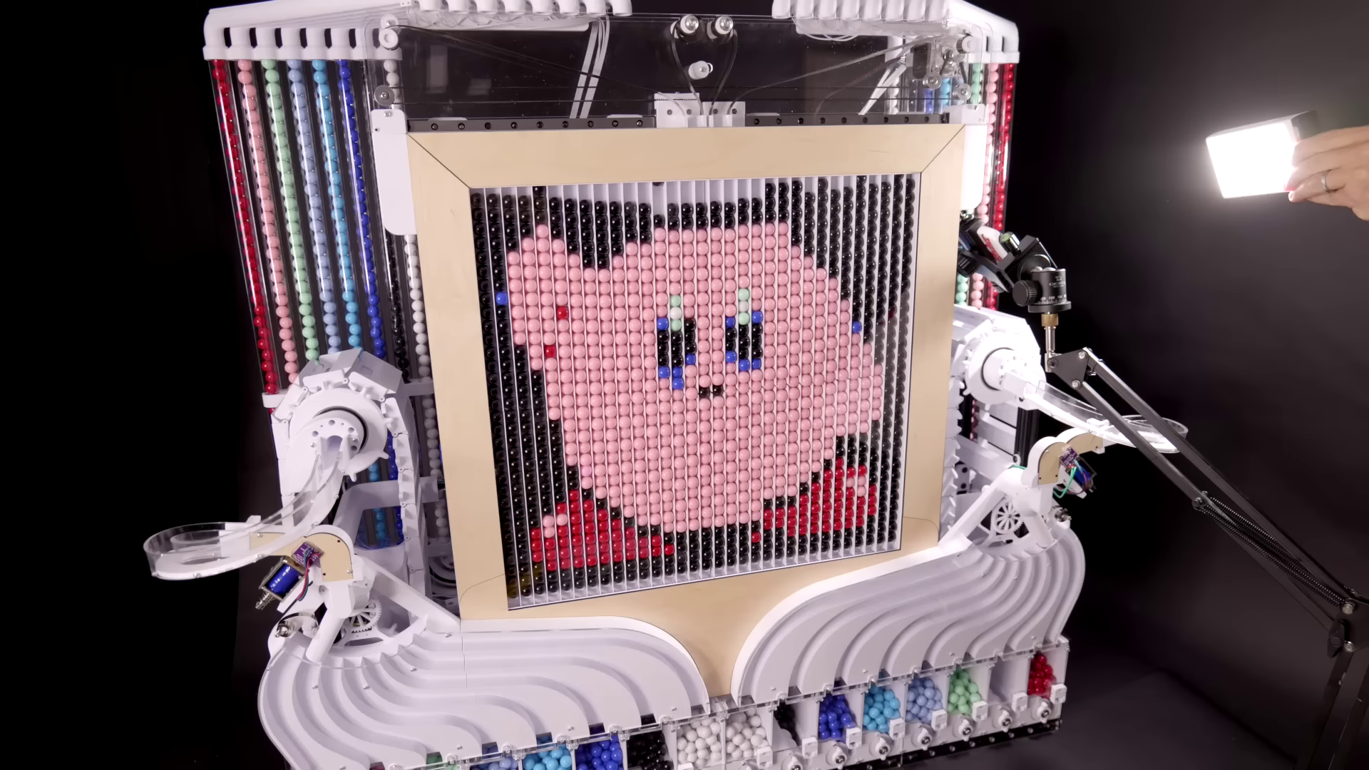Perhaps most ingenious is his use of constant-force springs as a flexible funnel to guide the marbles to a moving slider that drops them into the correct column of the display. When a picture is complete, sliding doors open on the bottom of the columns, dumping the marbles into a chain lift which feeds them into the sorting section. Each of the mechanisms has a mirrored version of the other side, so the left and right halves of the display operate independently.