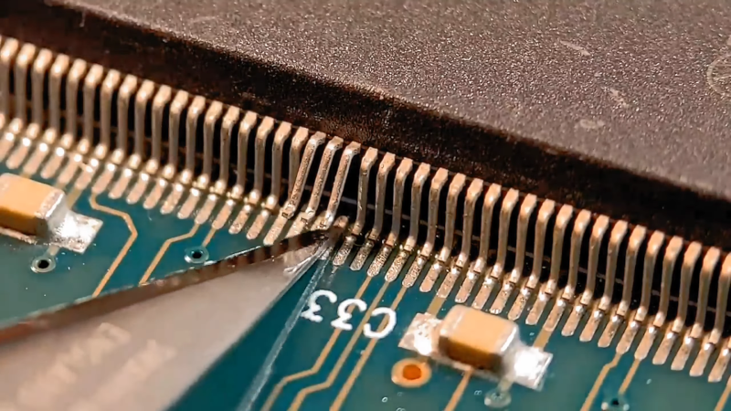 He doesn’t use anything exotic beyond a microscope. Just flux, a simple iron, and a scalpel blade. Oh, and very steady hands. The idea is to heat the joint, gently lift the pin with the blade, and wick away excess solder. If you do it right, you’ll be able to put the pin back down where it belongs later. He makes the sensible suggestion of covering the pad with a bit of tape if you want to be sure not to accidentally short it during testing. Or, you can bend the pin all the way back if you know you won’t want to restore it to its original position.