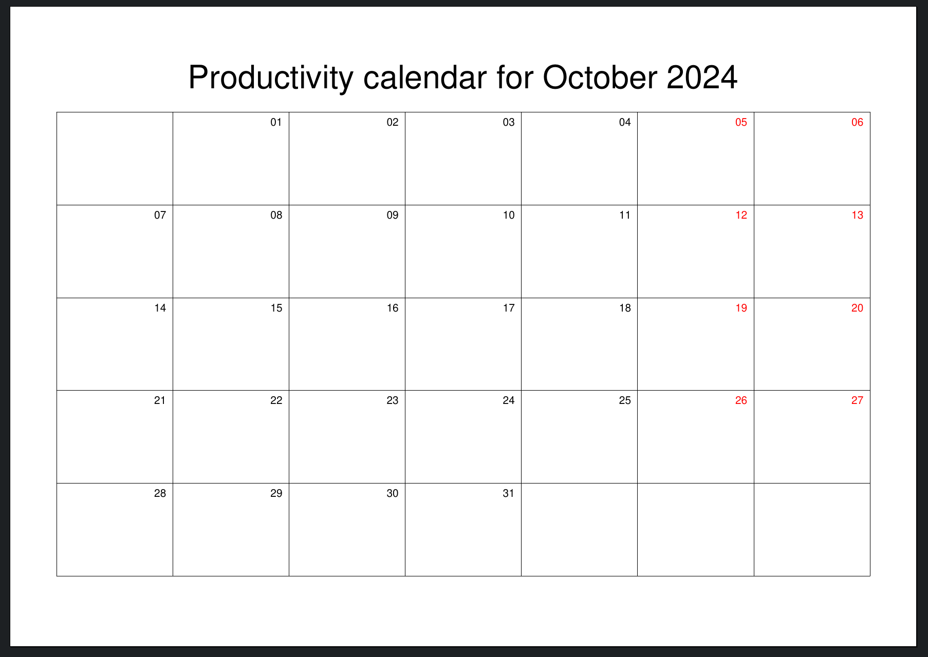 What about keeping a running-tally summary of what I hack on, and perhaps creating some sort of “streak” or “levelling” system? Maybe, each morning, giving me an overview on how my days went? I’ve written a “productivity calendar” program before, a generator of printable PDFs for each month. Every day, I’d try and write in my day-to-day tasks with a ballpoint pen.