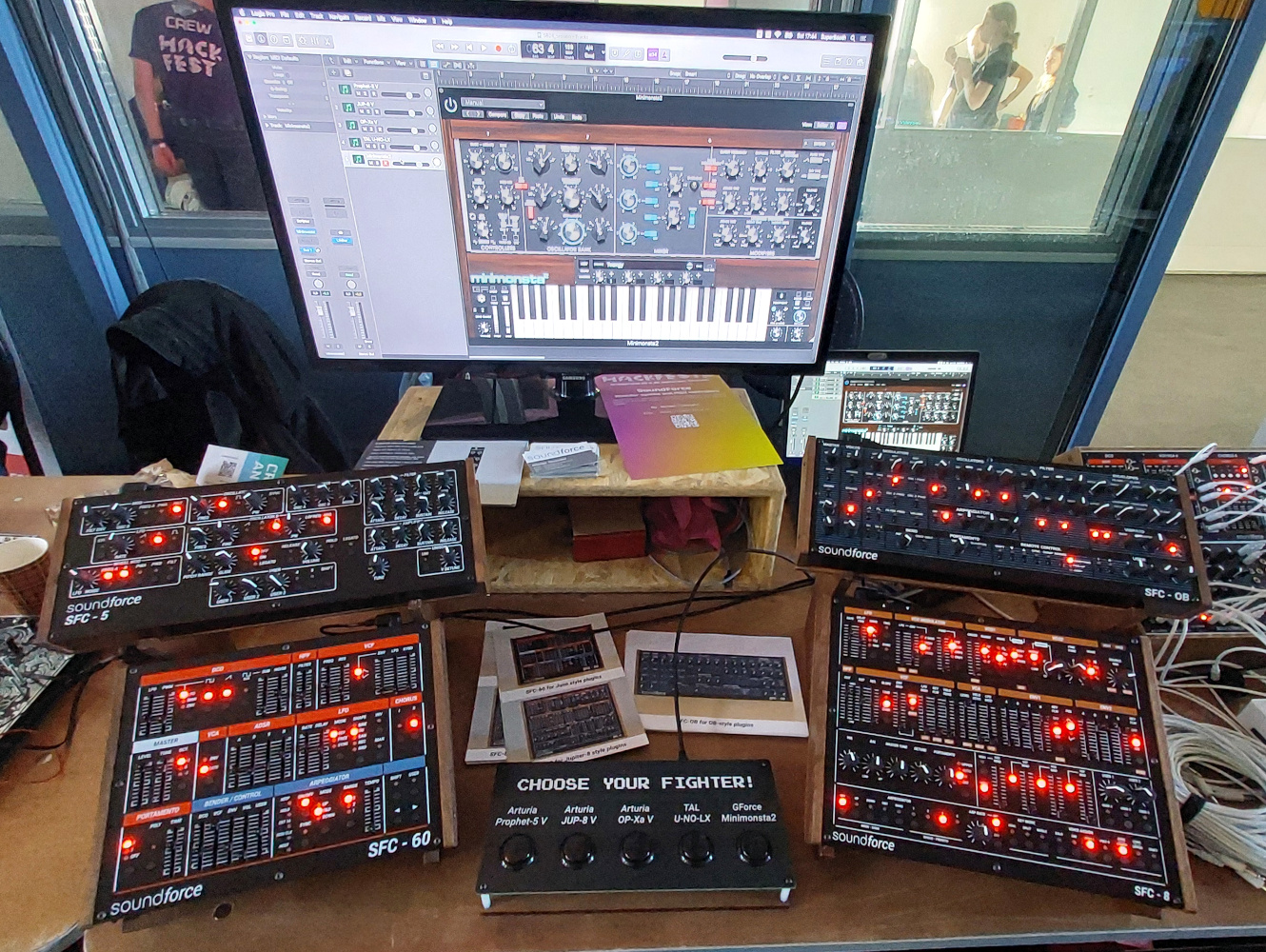 To give an idea of what’s here it’s time for a virtual trip round the hall. I’ll start with the music, aside from the demosceners there’s Printstruments with a range of 3D-printedmusical instruments, and Nerdy Gurdy, as you may have guessed, that hacker hurdy-gurdy I mentioned. This is perhaps one of few places I could have seen a spontaneous jam session featuring a 3D-printed bass and a laser-cut hurdy-gurdy. Alongside them were the Eurorack synthesisers of Sound Force, providing analogue electronic sounds aplenty.