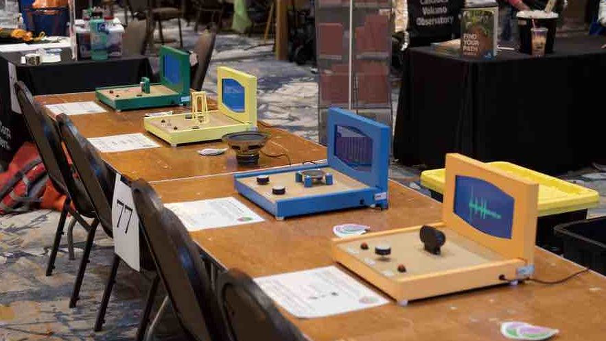 Catch The Wave! consists of four small tabletop cabinets. Each has physical controls and a screen, and each plays its role in teaching a lesson about electromagnets and sound waves, with a context of audio recording and playback.