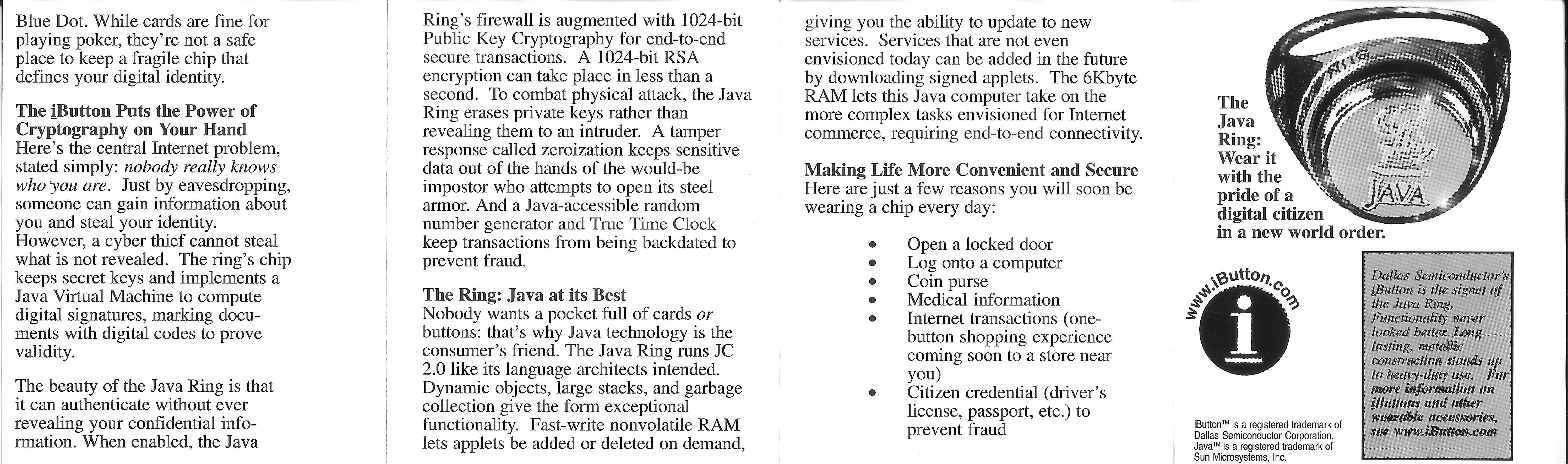 But probably the coolest part is that the embedded RAM is tamper-proof. If tampered with, the RAM undergoes a process called rapid zeroization that erases everything. Of course, while Java Rings and other iButton devices maybe be internally and externally tamper-proof, they can be lost or stolen quite easily. This is part of why the iButton came in many form factors, from key chains and necklaces to rings and watch add-ons. You can see some in the brochure below that came with the ring: