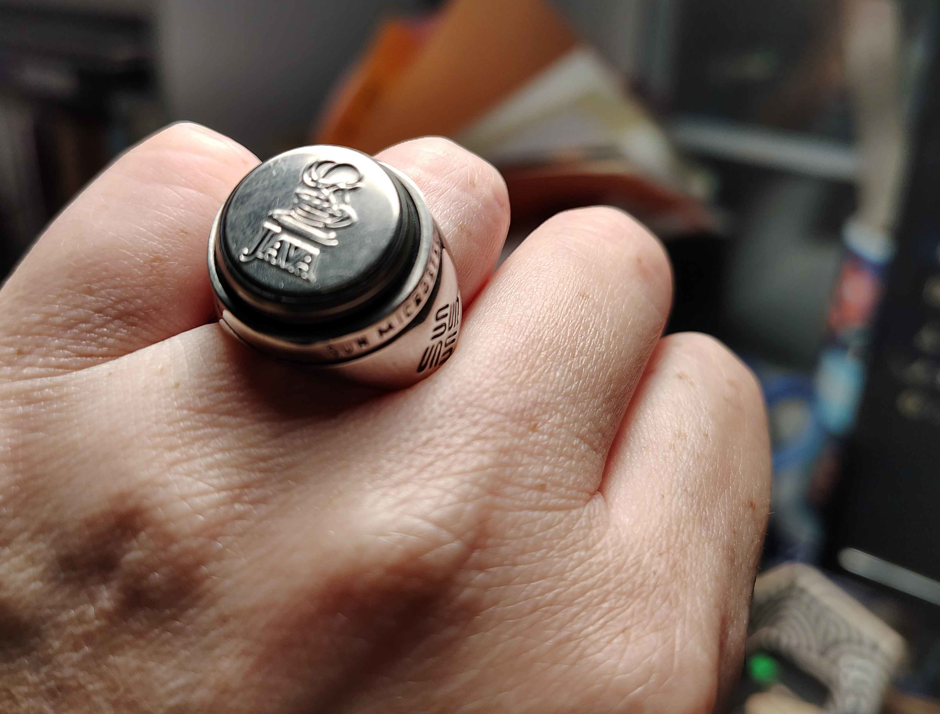 Perhaps the most late-nineties piece of tech jewelry ever produced, the Java Ring is a wearable computer. It contains a tiny microprocessor with a million transistors that has a built-in Java Virtual Machine (JVM), non-volatile storage, and an serial interface for data transfer.