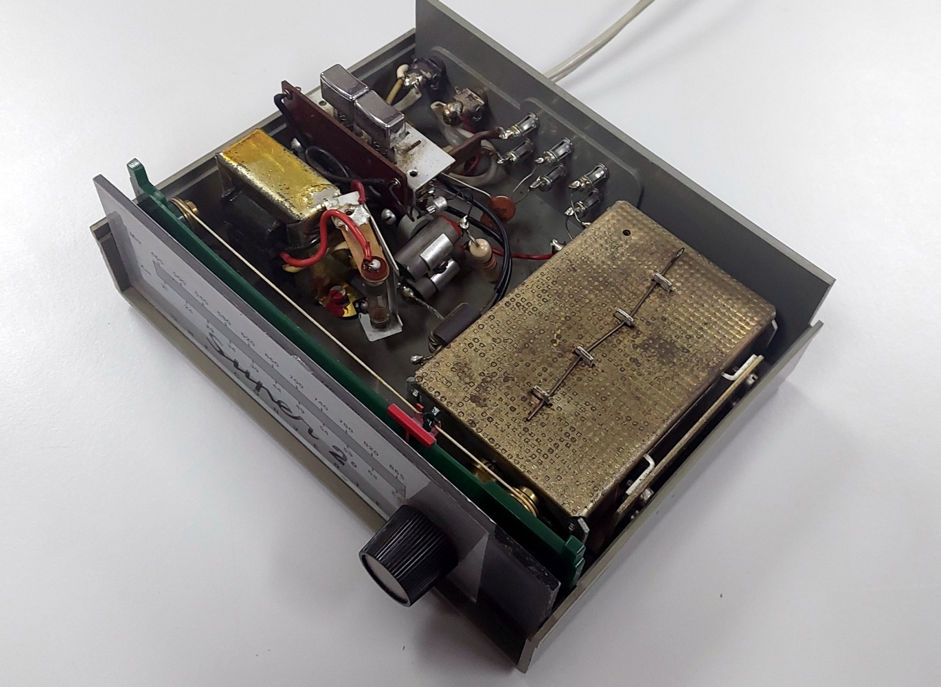 At first sight it’s fairly simple: a conventional mains DC power supply with no regulator and a metal tuner can. The scale mechanism is a string-and-gears affair, something quite common back in the day but a rare sight today. Unclipping the lid of the tuner can reveals its secret, this is the front end of a UHF TV tuner modified slightly to produce an output on a VHF broadcast channel. We’ve covered UHF TV tuners in the past, but if you’ve never encountered them here’s how they worked. Inside the can is a series of cavity tuned circuits containing two transistors. One of them is wired as an RF amplifier that works on the signal from the antenna, and the other is an oscillator. By mixing the amplified antenna signal with the oscillator output it’s possible to filter out an intermediate frequency, which is their difference. This was always 36 MHz, chosen because it lies just below the VHF broadcast band, and since this tuner needs to feed an unmodified VHF television, its output frequency will be a bit higher. We’re guessing that it’s been modified for a 41.25 MHz output, corresponding to the European VHF channel 1.