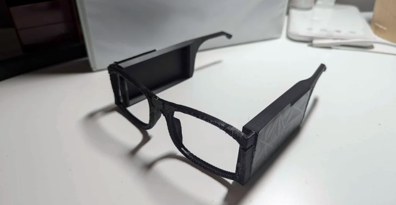 The frame is 3D printed, of course. Mounting the CPU, a camera, and a battery, along with a DC to DC converter, is fairly trivial. The real heavy lifting is in the software. The glasses snap a picture every ten seconds. It might be interesting to add a button or other means to let the user trigger a scan.