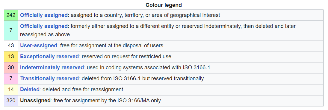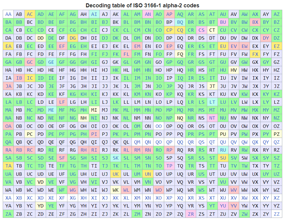 Wikipedia maintains an interactive decoding table that covers the full ISO 3166-1 alpha-2 code space, as used to designate ccTLDs. Credit: Wikipedia