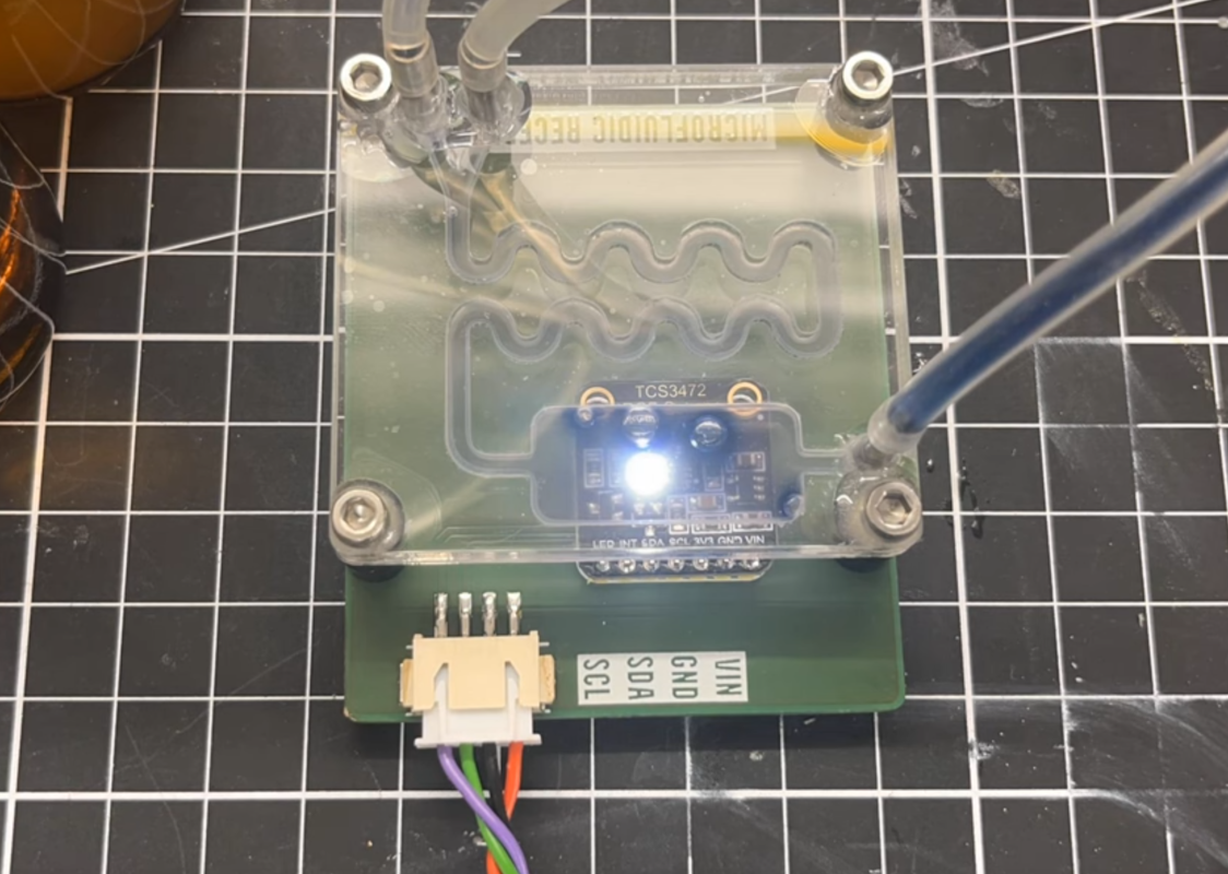 The key to the build is a set of three laser-cut acrylic sheets, which when sandwiched together provide a path for the fluid to flow as well as a chamber that will be monitored by electronic optical sensors. The fluid is pumped through the circuit by a custom-built syringe pump driven by a linear actuator, and when the chamber is filled the reaction can begin. In this case, if the fluid contains glucose it will turn blue, which is detected by the microcontroller’s sensors. The color value is then displayed on a small screen mounted to the PCB, allowing the experimenter to take quick readings.
