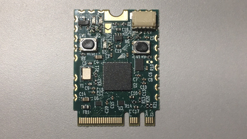 The board itself has the familiar m.2 edge connector at the bottom, and the RP2040 GPIO lines as postage-stamp indentations round the edges. On the m.2 front is uses the USB interface as well as a UART and the I2C lines, as well as some of the interfaces we’re less familiar with such as ALERT, WAKE, DISABLE1/2, LED 1/2, and VENDOR_DEFINED.