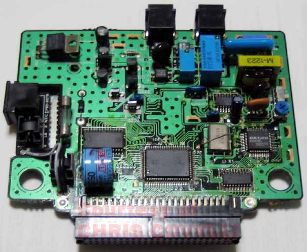 Internally, the Tsushin booster holds no surprises, with the expected POTS interfacing components tied to an OKI M6826L modem chip, the SRAM device, and what looks like a custom ASIC for the bus interfacing.