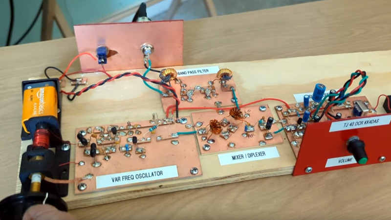 It’s a modular design, with all the constituent building blocks broken out into separate boards on which the circuitry is built Manhattan style. Direct conversion receivers are pretty simple, so that leaves us with only four modules for oscillator, bandpass filter, mixer, and audio amplifier. We particularly like that it’s permeability tuned using a brass screw and an inductor, to make up for the once-ubiquitous variable capacitors now being largely a thing of the past.