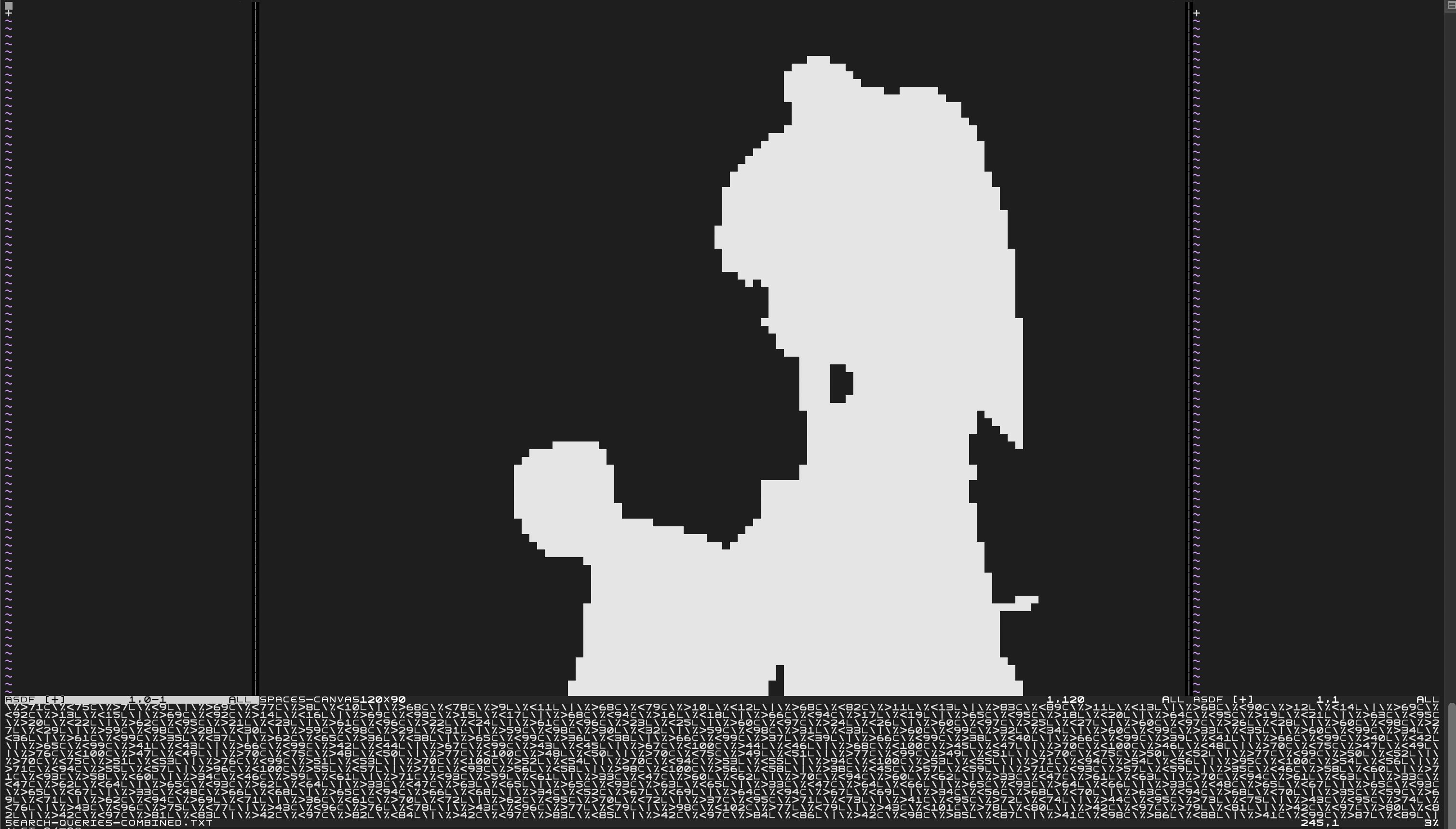 First 6,500 frames are fed through ffmpeg to get PNGs, which are converted these into pixel arrays using scripts on the GitHub project. Then the regex search combined with Vim macros allowed the video to be played at real-time speed, albeit at 120 x 90 resolution to give the PC a fighting chance. The highlighting provides the contrast with the unlit pixels, creating a rather nice result as can be seen in the embedded video.