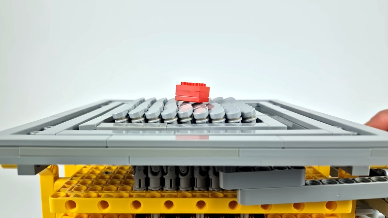 In principle the treadmill works by placing an object on a bed of identical, rotating discs. By tilting the discs, one controls which edge is in contact with the object, which in turn controls the direction the object moves. While the concept is straightforward, the implementation is a wee bit more complex. LEGO pieces offer a rich variety of mechanical functions, but even so, making a 9×9 array of discs all rotate in unison turns out to be a nontrivial problem to solve. Gears alone are not the answer, because the shafts in such a dense array are a bit too close for LEGO gears to play nicely.