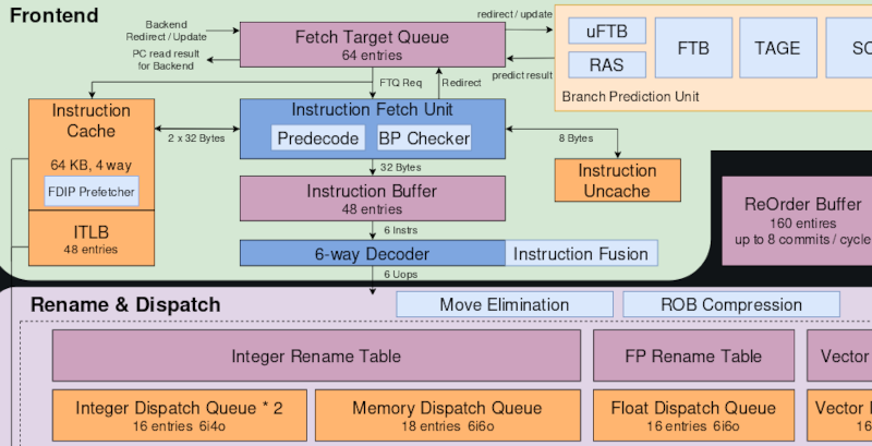 In the Git repository, you’ll find several branches including at least two stable branches: Yanqihu and Nanhu. The currently developed architecture, Kunminghu, is impressive, with a sophisticated instruction fetch unit, a reorder buffer, and a register renaming scheme.
