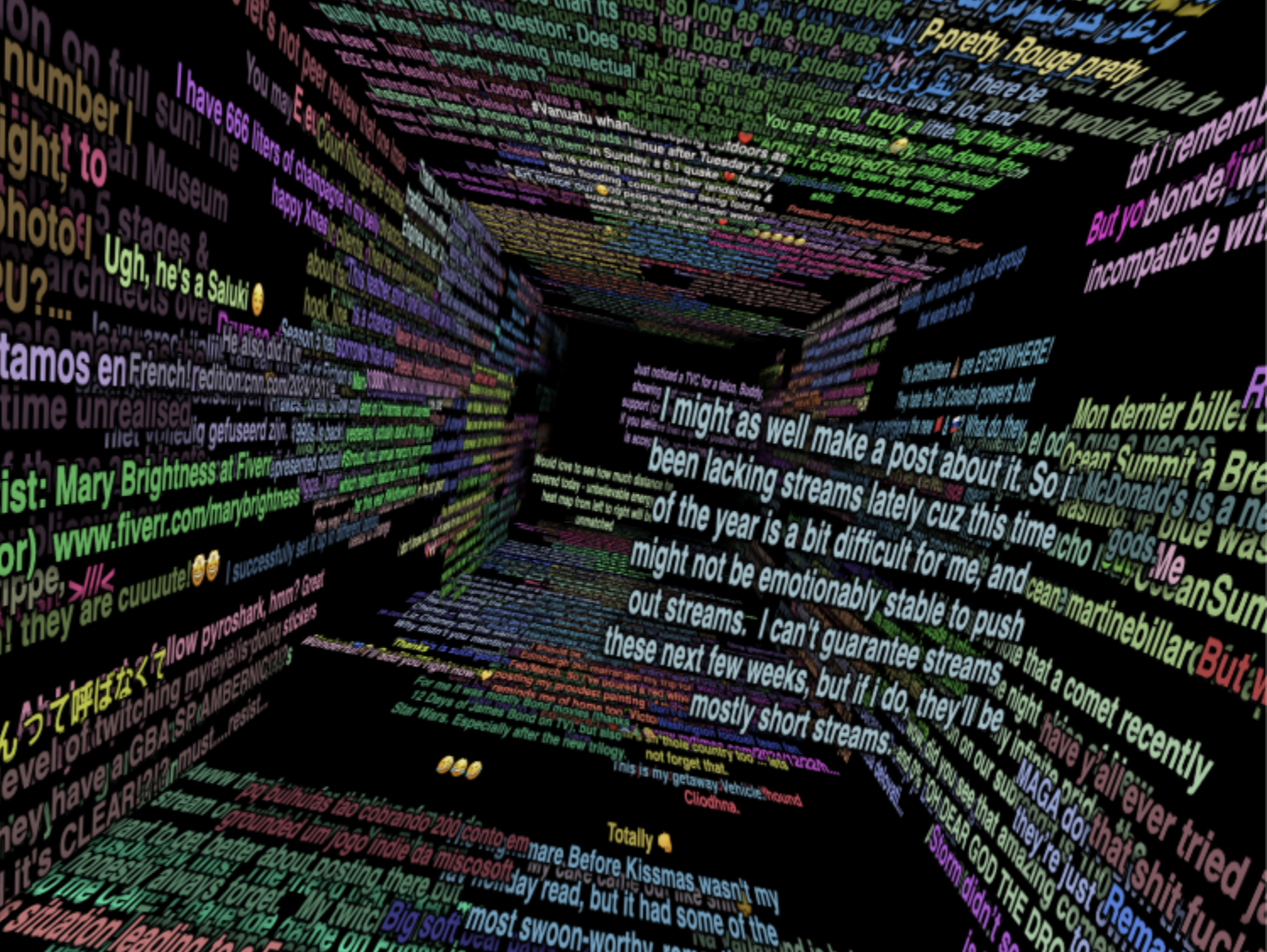 First, she collects as many skeets as there are empty columns on a screen from a Jetstream sever. This is calculated based on font style and size. She wrote an algorithm loosely inspired by CodePen, which does digital rain. If the skeet doesn’t fully render by the time it reaches the bottom of the screen, the rest appears at the top of the same column and falls until it’s done displaying. Then the column clears out and waits for a new skeet.