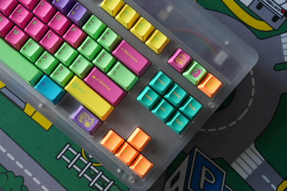 Remember those swishy-sounding two-piece trash-bag outfits people wore at the end of the 80s and into the early 90s? While many opted for the windbreaker by itself, the truly fashionable donned the entire track suit. This keycap set, DCS Windbreaker, hearkens back to a brighter time.