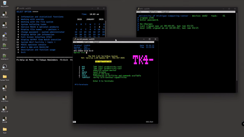 One problem with the mainframe environment is that there are a bunch of operating system-like things like MVS, VM/CMS, and TSO. There were even custom systems like MUSIC/SP, which he shows in the video below.