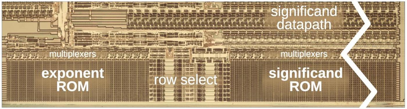 Multiplexer circuitry allows for the selection of the appropriate entry in the ROM. The exponent section always takes up 18 bits (1 for the significand sign). The significand section is actually 68 bits total, but it starts with a mysterious first bit with no apparent purpose.