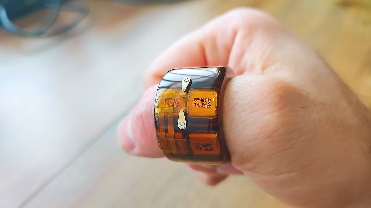The build is a hacky one. An arc generator circuit was pulled out from a jet cigarette lighter, and reconfigured to fit in a small ring-based form factor. It was hooked up with a power switch and a small bank of 30 mAh lithium polymer cell for power, and a compact USB-C charger board was installed to keep the batteries juiced. The electronics were then delicately assembled into a ring-shaped mold, which was injected with resin to produce the final ring. Once cast, a pair of small metal electrodes were installed on the outside. Activating the taser function is as simple as squeezing the ring—easy to do just by making a fist.