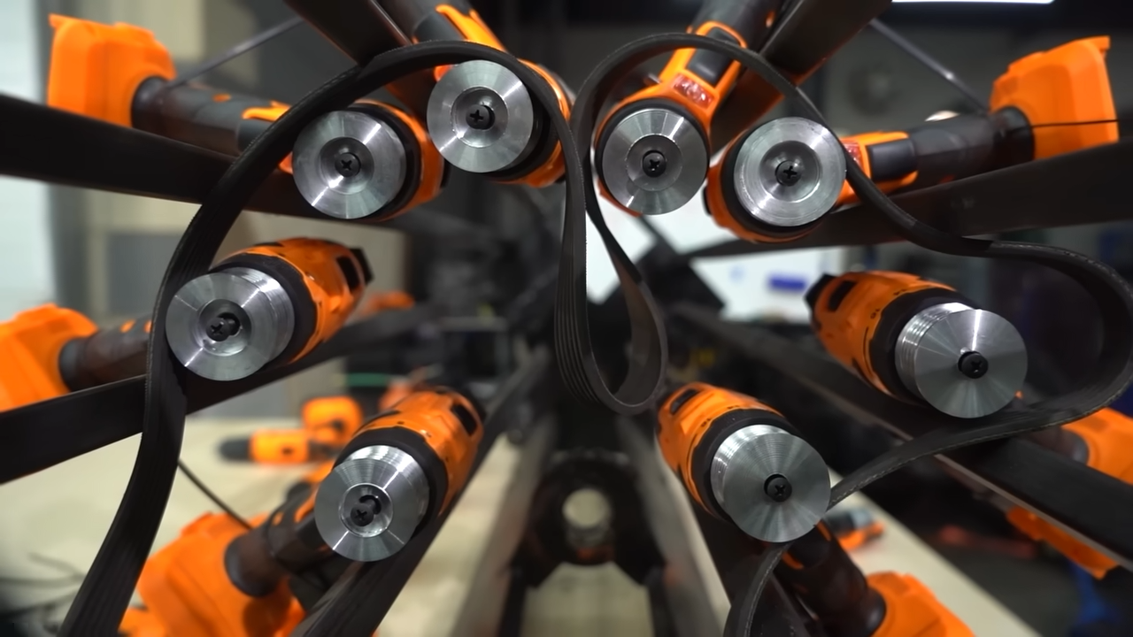 Here’s what’s in the new engine: each of the drills has its chuck replaced with an aluminum pulley, and belts connect each group of drills to an output shaft. Ideally, every drill motor would run at the same time and at exactly the same speed, but one works with what they have. [Garage 54] originally worked to synchronize the drills by interfacing to each drill’s motor control board, but eventually opted to simply bypass all controls and power each drill’s motor directly from the batteries. Initial tests are done by touching bare cable ends with a turned-away face and squinted eyes, but we expect “Just A Big Switch” to end up in the final assembly.